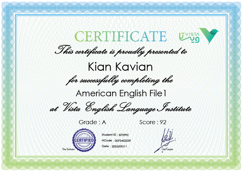 مدرک پایان دوره مرکز آموزش زبان های بین الملل ویستا