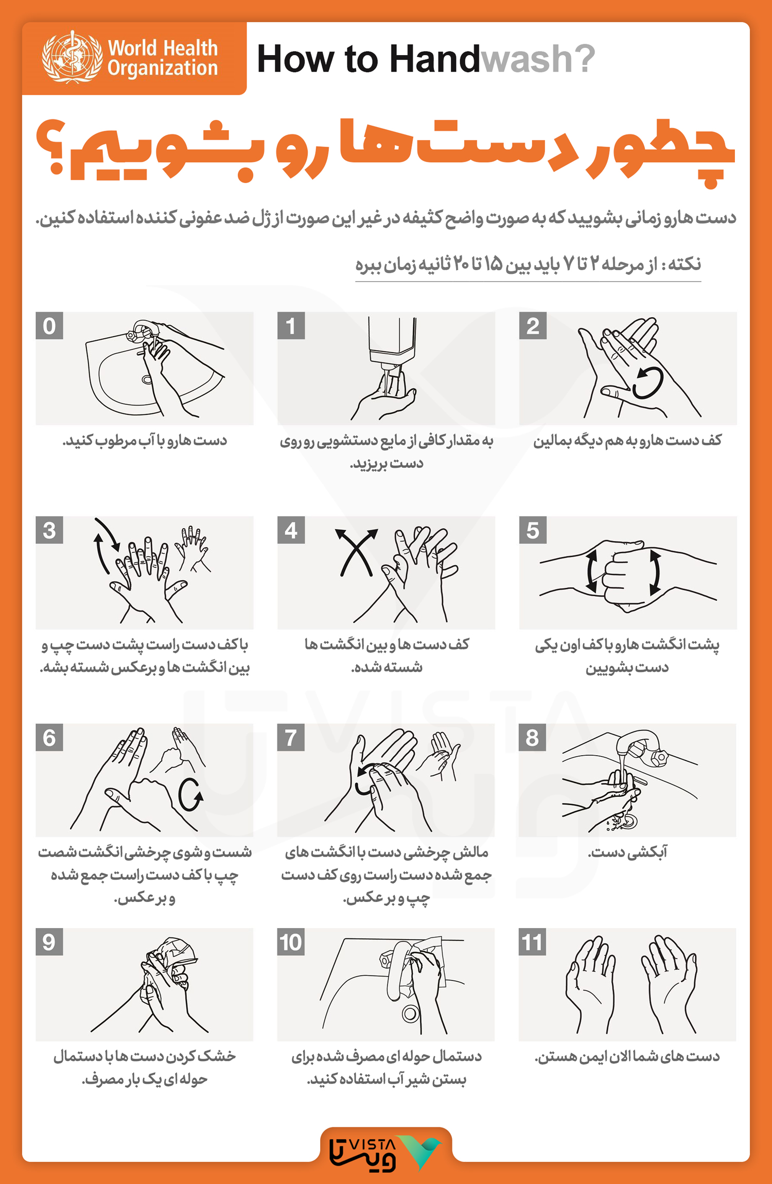 حالا این سازمان جهانی یک تصویر از آموزش صحیح شستشو دست با مایع صابون و صابون منتشر کرده است و در تیم موسسه فرهنگی آموزشی ویستا ترجمه شده تا در اختیار کاربران قرار گیرد.